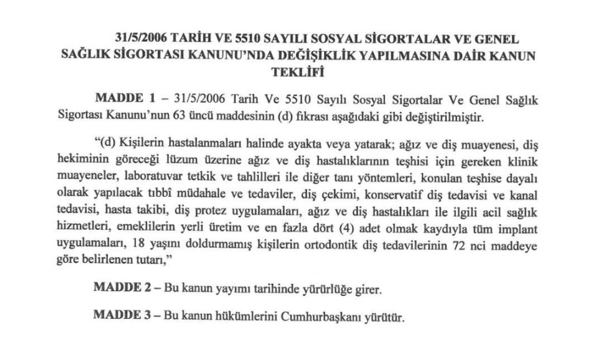 TBMM’ye sunulan kanun teklifi ile implant tedavisinde yerli üretim ve 4 adedi geçmemek şartı ile ücretin Sosyal Sigortalar Kurumu tarafından karşılanması önerildi.