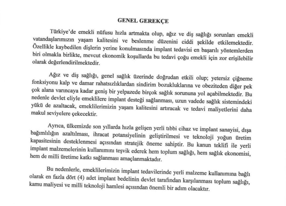 MHP olarak TBMM’ye sunduğumuz kanun teklifi ile başta emeklilerimizin durumunu düşünerek tüm vatandaşlarımız için ağız ve diş sağlığı kapsamında ihtiyaç duydukları “İMPLANT TEDAVİSİ” için yerli üretim ve en fazla 4 adet olmak üzere yapılacak tüm uygulamaların Sosyal Sigortalar Kurumu tarafından karşılanmasını önerdik.”